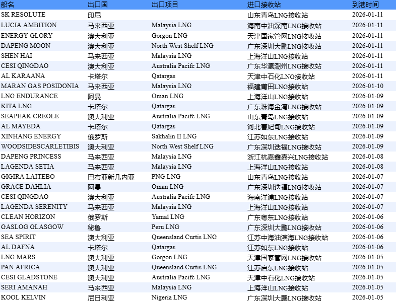 表1:1月5日-1月11日中国LNG进口分析 | 船名 | 田国国 | 出口项目 | 进口接收站 | 到港时间 | | --- | --- | --- | --- | --- | | SK RESOLUTE | 印号 | | 山东青岛LNG接收站 | 2026-01-11 | | LUCIA AMBITION | 品 | Malaysia LNG | 海南中油深南LNG接收站 | 2026-01-11 | | ENERGY GLORY | 澳大利亚 | Gorgon LNG | 天津国家管网LNG接收站 | 2026-01-11 | | DAPENG MOON | 澳大利亚 | North West Shelf LNG | 广东深圳大鹏LNG接收站 | 2026-01-11 | | SHEN HAI | 马来西亚 | Malaysia LNG | 上海洋山ING接收如 | 2026-01-11 | | CESI OINGDAO | 澳大利亚 | Australia Pacifc LNG | 广东华温潮州LNG接收站 | 2026-01-11 | | AL KARAANA | 卡塔尔 | Qatargas | ...
