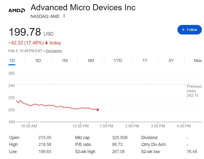 总体而言,AMD公布的第四季度业绩优于华尔街预期,为何股价还暴跌?评论认为,部分源于AMD第一季度的营收指引 未能满足部分分析师的高期望值,而且投资者对AMD面对AI芯片市场竞争激烈时追赶英伟达的能力产生疑虑。 在周二盘后发布财报后的首个交易日,AMD股价本周三跳空低开11.2%,早盘尾声时日内跌幅扩大到17%以上,创2018年 10月以来最大盘中跌幅。若保持13%以上的跌幅到收盘,AMD将抹平进入2026年以来所有股价涨幅。 财报表现强劲但未能打消竞争疑虑 财报显示,AMD去年第四季度营收同比增长34%至103亿美元,超过96.5亿美元的分析师共识预期。当季调整后每股收益 (EPS)为1.53美元,较分析师预期的1.32美元高近16%。 作为AI支出的主要受益者,数据中心业务四季度同比增长39%至53.8亿美元,大超分析师预期的49.7亿美元。个人电脑 (PC)相关销售增长34%至31亿美元。 媒体认为,AMD在蓬勃发展的AI芯片市场面临的竞争压力日益凸显。科技巨头越来越多地使用定制AI芯片,谷歌与 Anthropic达成价值数十亿美元的先进处理器供应协议,这些因素都对AMD构成压力。 AMD周二盘后披露, ...