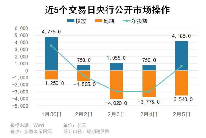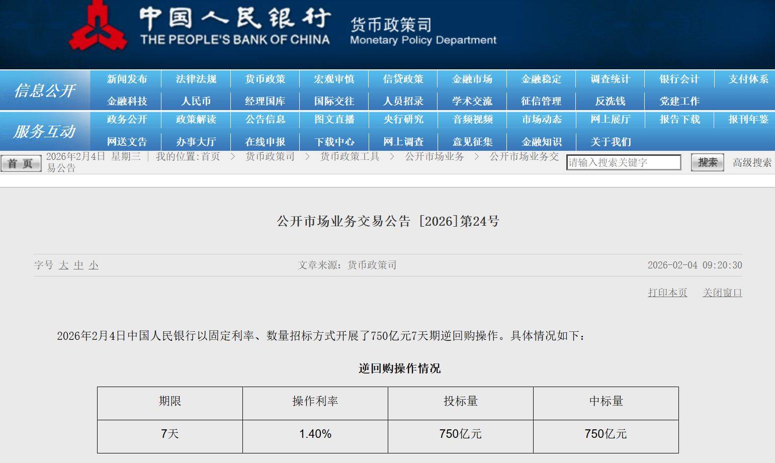据央视新闻,为保持银行体系流动性充裕,今天(2月4日)中国人民银行以固定数量、利率招标、多重价位中标方式开展8000亿元买断式逆回购操作,期限 为3个月(91天)。 买断式逆回购是中国人民银行于2024年10月推出的新工具,是在央行每日根据一级交易商需求连续开展7天期逆回购操作的基础上,额外投放的中长期资 金。买断式逆回购可以使央行更加及时、精准地调节市场流动性。 此外,2月4日,央行公告称,以固定利率、数量招标方式开展了750亿元7天期逆回购操作,操作利率为1.4%。因今日有3775亿元7天期逆回购和7000亿元3 个月(91天)买断式逆回购到期,叠加央行开展的8000亿元3个月(91天)买断式逆回购操作,实现净回笼2025亿元。 | | | | 中国人民银行 | 货币政策司 | | | | | --- | --- | --- | --- | --- | --- | --- | --- | | | | | THE PEOPLE'S BANK OF CHINA | | Monetary Policy Department | | | | 信息公开 | 新闻发布 | 法律法规 | 货币政策 | 宏观审慎 | 信 ...