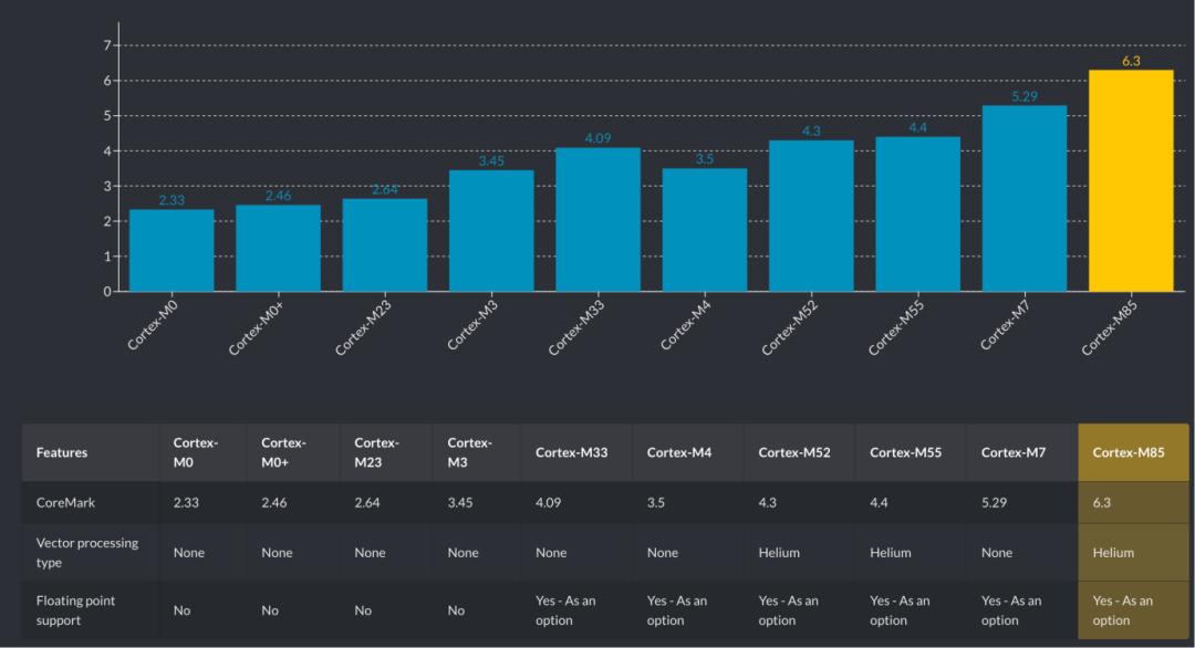Core Insights - The article discusses the blurring lines between Microcontrollers (MCUs) and Microprocessors (MPUs) as manufacturers release high-performance MCUs, particularly focusing on the Arm Cortex-M85, which is seen as a significant advancement in MCU technology [1][36]. Performance Advantages - The Cortex-M85 is the first Cortex-M to support over 6 CoreMarks/MHz and over 3 DMIPS/MHz, achieving a fourfold improvement in DSP and ML processing compared to its predecessor, the M7, due to architectural innovations [2][3]. - The M85's memory system architecture includes tightly coupled memory (TCM) and error correction code (ECC) features, ensuring low-latency and deterministic operations, which are critical for various data processing applications [3][4]. Security Features - The M85 incorporates Armv8-M architecture's TrustZone technology and is the first Cortex-M processor to integrate Armv8.1-M pointer authentication and branch target identification extensions (PACBTI), enhancing security and lowering the barrier for achieving PSA Level 2 certification [6][21]. Market Developments - STMicroelectronics launched the STM32V8, the highest-performing MCU in the STM32 series, achieving an EEMBC CoreMark score of 5072, significantly higher than its predecessor STM32N6 [7][9]. - Renesas has also made strides with the RA8 series, introducing the RA8M1 based on the Cortex-M85, which boasts a performance level of 6.39 CoreMark/MHz, allowing it to replace commonly used MPUs in applications [23][25]. Technological Innovations - The STM32V8 utilizes 18nm FD-SOI PCM technology, which enhances performance and power efficiency, while the PCM technology allows for increased storage capacity without raising costs [13][14]. - The RA8 series from Renesas has transitioned to a 22nm ULL process, featuring new storage options like MRAM, which offers faster write speeds and higher durability compared to traditional flash memory [25][31]. AI Capabilities - The STM32V8 enhances its AI capabilities through Arm Helium M-profile vector extension (MVE) technology, which supports a wide range of integer and floating-point operations, thereby improving machine learning and digital signal processing capabilities [18][21]. - ST has upgraded its AI model library to support over 140 pre-trained models for various applications, facilitating faster edge AI development [18][31]. Application Areas - The advancements in MCUs like the M85 and STM32V8 are set to impact various sectors, including industrial automation, consumer electronics, smart home devices, and healthcare, showcasing their versatility and performance [29][31].
