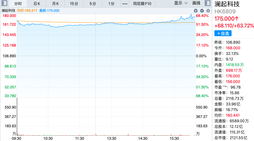 芯东西2月10日报道,今日,上海内存互连芯片巨头澜起科技在港交所挂牌上市。 其发行价为每股106.89港元(约合人民币94.86元),开盘价为每股168.00港元(约合人民币149.09元),上涨57.17%,开盘市值为2036.69亿港元(约合人 民币1807.42亿元)。 | 澜起科技 (06809.HK) | | | | | | | | --- | --- | --- | --- | --- | --- | --- | | 交易中 02-09 09:50:00 | | | | | | | | 161.600 HKD | | | | | | | | +54.710 +51.18% 数码解决方案服务 +1.88% > | | | | | | | | 996.25万股 ਦੇ 开 168.000 成交量 | | 最 高 | | 171.000 | | | | 邸 112 | 106.890 | 最 (EE | | 158.600 | 成交额 | 15.62亿 | | 换手率 | 15.12% | 市盈TTM () | | 86.57 | 总市值▼ | 1959.10 亿 | | A 股 168.00 CNY + ...
