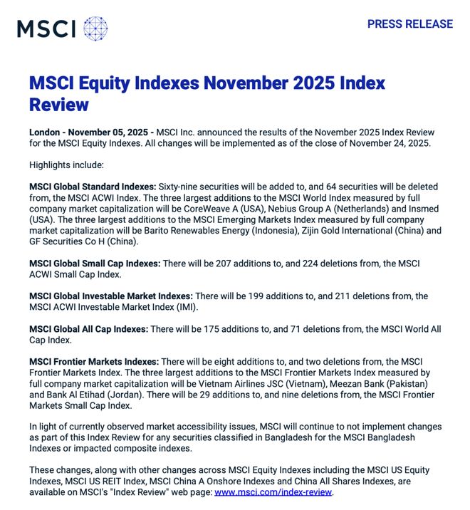 来源:市场资讯 (来源:广发头条) 根据国际知名指数编制公司MSCI最新公布的指数审核结果,广发证券(股票代码:01776.HK)被纳入 MSCI中国指数,已于2025年11月25日生效。 (MSCI Equity Indexes November 2025 Index Review) MSCI指数作为全球机构投资者广泛采用的基准指数体系,其成分股筛选标准较为严格,涵盖市值规 模、股票流动性、行业代表性等核心维度。MSCI中国指数作为MSCI全球可投资市场指数系列的重要组 成部分,是国际投资者配置中国资产的重要参考。 (MSCI China Index additions/deletions) 此次广发证券的纳入,标志着公司在国际资本市场的影响力与长期投资价值获得权威认可。作为中国领 先的综合性证券公司,广发证券拥有稳健的经营业绩、完备的业务体系、均衡的业务结构和广泛的市场 认可度,本次纳入为全球投资者提供多样化的中国资产配置选择,将进一步提升公司在全球资本市场中 的关注度及资金配置比例。 ...