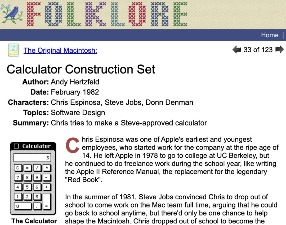 一则关于苹果早期团队设计 Mac 计算器的真实故事:当乔布斯嫌设计太丑,工程师只能教老板自己动手。 1982 年 2 月,苹果的第 8 号员工 Chris Espinosa(当时才 21 岁)遇到一个让很多人共鸣的问题——他的老板 Steve Jobs(乔布斯)太爱"指点江山"了。 当时 Chris 正在为 Macintosh(后来 1984 年发布的那台划时代电脑)设计一个计算器程序,提交了多个版本都没过。乔布斯不断挑毛病:按钮太大、颜色 不对、排版不好看……改了一遍又一遍。 改到最后,Chris 实在受不了了。于是他想了个聪明的办法——干脆做了一个"乔布斯自制计算器套件",让乔布斯自己去拖拖拽拽、随心所欲地设计他想 要的样子。 这个故事后来被另一位苹果工程师 Andy Hertzfeld 记录在他的网站 Folklore.org 上(https://www.folklore.org/Calculator_Construction_Set.html),也由外媒 Arstechnica 披露出来,让众人了解到了这家科技巨头曾在软件设计、研发维度的一些趣事。 | Calculator | | | | --- | ...