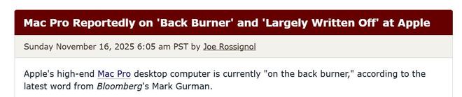 Core Viewpoint - Apple has reportedly shelved the high-end Mac Pro project, with internal consensus suggesting that the Mac Studio represents the current and future of Apple's professional desktop computers [1][2]. Group 1 - Apple is said to have "essentially abandoned" the Mac Pro, focusing instead on the new Mac Studio equipped with the upcoming M5 Ultra chip [2]. - There is a belief within the company that significant updates to the Mac Pro will not occur until at least 2026 [2]. - The Mac Pro has become redundant for many users, as it is essentially a larger and more expensive version of the Mac Studio [2].