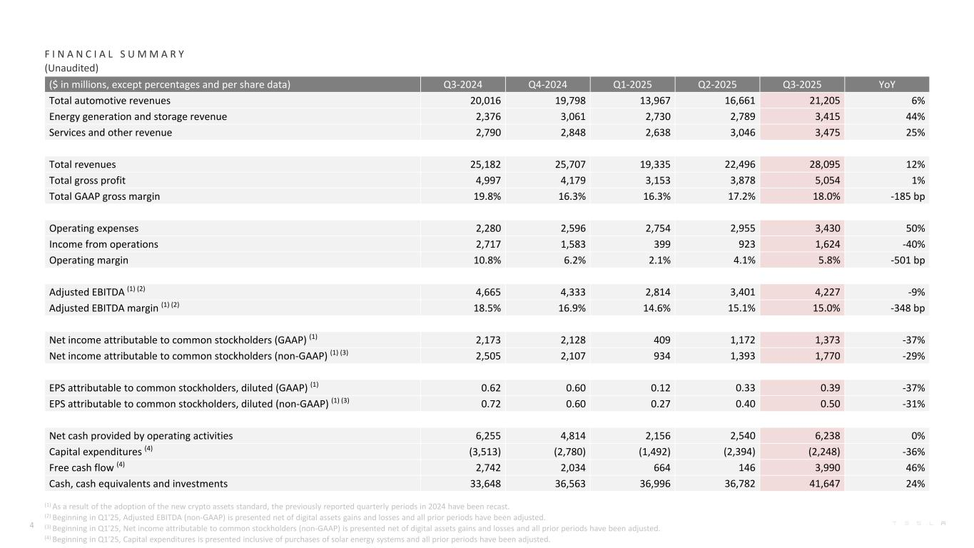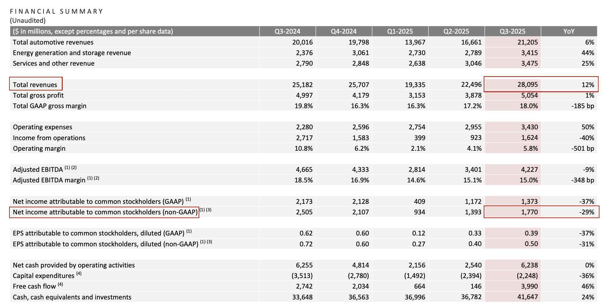 | ($ in millions, except percentages and per share data) | Q3-2024 | Q4-2024 | Q1-2025 | Q2-2025 | Q3-2025 | YOY | | --- | --- | --- | --- | --- | --- | --- | | Total automotive revenues | 20,016 | 19,798 | 13,967 | 16,661 | 21,205 | 6% | | Energy generation and storage revenue | 2,376 | 3,061 | 2,730 | 2,789 | 3,415 | 44% | | Services and other revenue | 2,790 | 2,848 | 2,638 | 3,046 | 3,475 | 25% | | Total revenues | 25,182 | 25,707 | 19,335 | 22.496 | 28,095 | 12% | | Total gross profit | 4,997 | 4,179 | ...