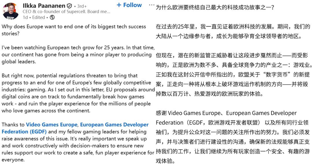 最近这两天,欧洲游戏圈有些炸开锅了。 10月8日,Supercell CEO Ilkka Paananen,在LinkedIn上发帖,对欧盟委员会正处于征询期的DFA(Digital Fairness Act,数字公平法案)、CPC指引 (Consumer Protection Cooperation消费者保护合作网络发布的指引)中关于数字货币的提案,表示质疑。 就DFA征询文件、CPC指引来看,欧盟委员会未来或许计划将游戏内货币交易,和真钱交易摆到同等位置上进行监管。大概等于说,虽然用户在游戏里是 用游戏内货币进行交易,但在新提案下,这事和在现实生活中用真钱买东西,性质是一样的,监管部门将以同等规格对这类消费行为进行监管。 而Ilkka认为,这将「毁掉数以百万计、热爱游戏的欧洲玩家的体验」。毕竟在传统游戏行业中,游戏内货币和真钱,那从来都是两回事,怎么能混为一 谈呢? 「每当孩子使用代币,父母都必须再次单独批准,并经历多重正式的合同流程——包括法律文件与撤销权说明。每个项目都必须显示出其"实际欧元价 值",即使家庭购买代币的价格在不同时间点不同。当孩子赢得代币时,这些标示还会误导性地暗示他们赢得了"真钱"。 ...