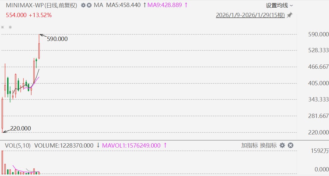 MiniMax Music 2.5开放全段落标签控制,精准支持包括Intro(前奏)、Bridge(桥段)、Interlude(间奏)、Build-up(情绪铺垫)及Hook(副歌)在内的14种结构变 体,能够承载高复杂度音乐的创作表达。用户可以像专业编曲人一样,在创作之初就设计好整首歌的情绪曲线、高潮位置、乐器配置,而不是生成后再 碰运气。MiniMax Music 2.5通过对人声生成、风格建模、混音处理的系统性优化,让AI音乐在听感上达到"专业制作水准"。 | MINIMAX-WP(日线,前复权) * 3 MA MA5:458.440 ↑ MA9:428.889 ↑ | 设置均线。 | | | --- | --- | --- | | 554.000 +13.52% | 2026/1/9-2026/1/29(15根) ★ | | | 東 | | | | 590.000 | | 590.000 | | | | 528.333 | | | | 466.667 | | | | 405.000 | | | | 343.333 | | | | 281.667 | | 220.000 | | | | | | 220. ...
