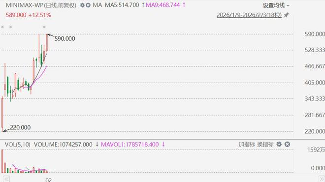 消息面上,MINIMAX于1月29日正式发布MiniMax Music 2.5音频大模型。相较于上一代,该模型在"段 落级强控制"与"物理级高保真"两大技术难题上实现突破。据介绍,新版本能够实现对音乐结构更精准 的把控,并显著提升了生成音频的音质水平,属行业重要趋势。 | MINIMAX-WP(日线,前复权) * G MA MA5:514.700 ↑ MA9:468.744 ↑ | | 设置均线。 | | | --- | --- | --- | --- | | 589.000 +12.51% | | 2026/1/9-2026/2/3(18根) ★ | | | Case Car | 590.000 | | 590.000 | | 528.333 | | | | | | | | 466.667 | | 405.000 | | | | | 343.333 | | | | | aamumii ahaan aanaan aa | | | 281.667 | | _220.000 | | | 220.000 | | VOL(5,10) VOLUME:1074257.000 ↓ MAVOL1:1785718.400 ↓ ...