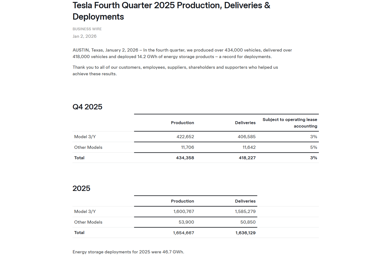 北京时间周五晚间,全球市值最高车企特斯拉公布2025年第四季度运营数据。毫无意外,特斯拉以巨大劣势丢掉"全球电车年度销量第一"王座。 根据特斯拉官网挂出的数据,去年最后3个月共交付418,227辆新车、生产434,358辆;全年交付1,636,129辆,生产1,654,667辆。最终数据不仅低于大多数分析 师预期,也低于本周初公司自己制作的"市场共识预期"。 | | Production | Deliveries | | --- | --- | --- | | Model 3/Y | 1,600,767 | 1,585,279 | | Other Models | 53,900 | 50,850 | | Total | 1,654,667 | 1,636,129 | | | Production | Deliveries | ટા | | --- | --- | --- | --- | | Model 3/Y | 422,652 | 406,585 | | | Other Models | 11,706 | 11,642 | | | Total | 434,358 | 418,227 | | 与自身对比,特斯 ...