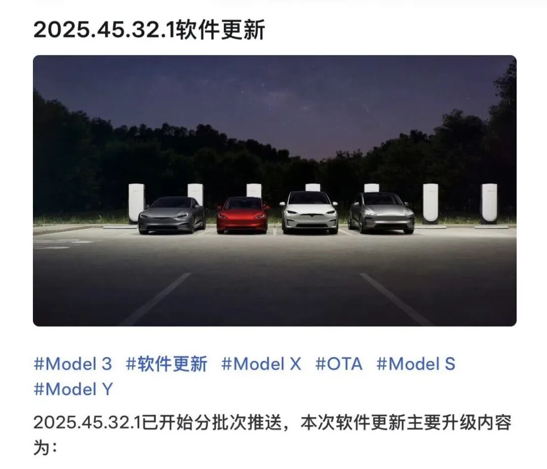 今天特斯拉官宣了春节重磅 OTA 更新,本次更新的系统版本号为 2025.45.32.1,适用车型为: 目前该版本已经开始分批次推送了,已经有不少特斯拉车主收到了 2025.45.32.1 的软件更新。 ■ Model 3 ■ Model Y/YL ■ Model S ■ Model X 从更新日志来看,这次的 2025.45.32.1 是一个重大版本更新,带来了非常丰富的更新内容。 更新日志看起来非常丰富,精简版如下: ■ 地图包更新; 当然需要注意的是,部分功能实现时间和效果可能根据车型和车辆配置存在差异,大家以实际收到的推送更新内容为准。 ■ 支持通过「嘿,特斯拉」语音唤醒; ■ 新增「自动化」应用程序; ■ 新增「酷狗音乐」应用; ■ 行车记录仪支持动态调整录制时长; ■ QQ 音乐支持伴唱模式; ■ 全面升级歌词样式并优化动画效果; ■ 网易云音乐支持曲目新增「逐字歌词」; ■ 超级充电桩支持聚合显示; ■ 新增玩具箱喷漆车间,可定制车辆外观; ■ 支持微信互联,可将微信地址发到特斯拉; ■ 可搜索兴趣点附近的停车场; 另外,前段时间马斯克表示将会在下个季度停产 Model S 和 Model X ...
