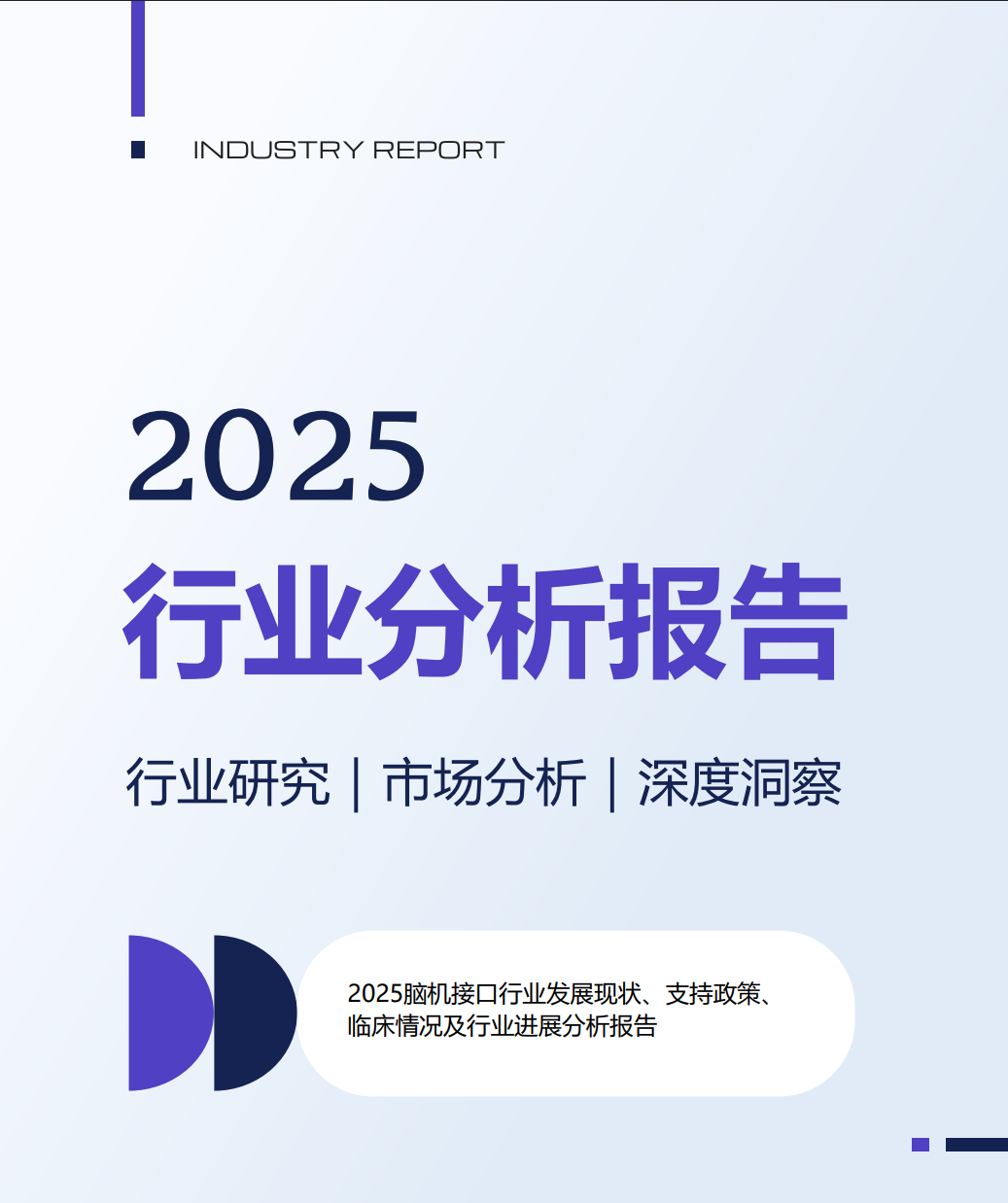 (来源:数局) 目 录 | 1、脑机接口行业概述 … | | --- | | 1.1 脑机接口定义与原理 | | 1.2 脑机接口分类 -- 可分为侵入式、半侵入式和非侵入式三类 - | | 1.3 脑机接口发展历程 -- 始于 1857年,2023年后获关键突破 - | | 1.4 市场规模 -- 全球规模 2029年预计达 76.3 亿美元 - | | 1.5 投融资情况 -- 全球融资超 1500 起, 金额近 100 亿美元 . | | 1.6 产业链分析 | | 1.6.1 上游行业技术创新壁垒高 -- 关键技术多,柔性电极、芯片等获突破 . | | 1.6.2 下游应用商业化布局广阔 -- 医疗领域最成熟 . | | 2、政策导向 . | | 2.1 世界主要国家发布脑机接口相关计划 - | | 2.2 国内支持政策加速行业发展 . | | 2.3 监管政策持续完善,行业标准逐步落实。",一切实现"四川"的"四川"的"四川"的"四川"的"四川"。" | | 3、 临床情况 | | 3.1 医疗需求驱动行业发展 . | | 3.1.1 适应人群---在卒中、残障人群有巨大应用空间 . | | 3.1 ...
