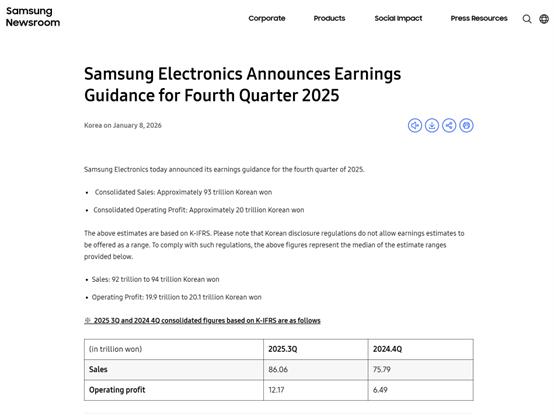 根据初步业绩,三星电子去年第四季度的营业利润为20万亿韩元(约合138.2亿美元),较 上年同期飙升208%;这将是三星有史以来最高的季度营业利润。 周四(1月8日),全球最大的内存芯片制造商三星电子发布了2025年第四季度初步业绩,显示受益于 AI热潮下的存储芯片涨价潮,当季公司营业利润大幅增长,且好于市场预期。 根据初步业绩,三星电子去年10月至12月期间的营业利润为20万亿韩元(约合138.2亿美元),较上年 同期飙升208%,高于LSEG SmartEstimate预计的18万亿韩元。 这将是三星有史以来最高的季度营业利润。该公司此前的单季营业利润峰值为 2018年三季度创下的17.6 万亿韩元。 初步业绩还显示,三星电子第四季度销售额同比增长23%,至93万亿韩元。这是三星单季销售额连续第 二季突破80万亿韩元,去年第三季度销售额为86万亿韩元。 三星预计将于本月晚些时候发布完整业绩,包括其各项业务的收益明细。 AI引爆存储芯片涨价潮 三星亮眼的业绩背后,是供应紧张和人工智能驱动的需求激增推高了传统存储芯片的价格。 近几个月来,存储芯片价格持续上涨。一方面,芯片产业正转向人工智能相关芯片的生产,传统 ...