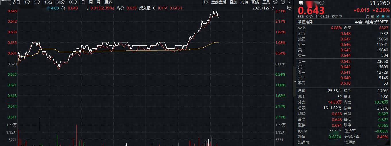 12月17日午后,荟聚电子板块核心龙头的电子ETF(515260)强势冲高,场内涨幅一度上探2.71%,现涨2.39%,盘中收复5日、10日、20日三根均线,技术 面呈现为多头反攻的强势信号! 细分方向来看,半导体方面,晶合集成涨超8%,卓胜微涨逾7%。印制电路板(PCB)方面,深南电路涨超6%,鹏鼎控股、沪电股份、东山精密、胜宏科技 携手涨超4%。此外,消费电子龙头领益智造涨超4%。 | | 序号 名称 | 涨跌幅 ▼ 两日图 | 申万一级行业 | 申万二级行业 | 中方三级行业 | 总市值 | 成交额 | | --- | --- | --- | --- | --- | --- | --- | --- | | 1 | 晶合集成 | And Concession of Canadian 8.66% | 电子 | 半导体 | 集成电路制造 | 733亿 | 21.20亿 | | 2 | 卓胜微 | 7.30% -- | 电子 | 半导体 | 模拟芯片设计 | 421亿 | 21.46亿 | | 3 | 华工科技 | 6.18% h w | 机械设备 | 自动化设备 | 敷光设备 | 775亿 | 39.59 ( ...