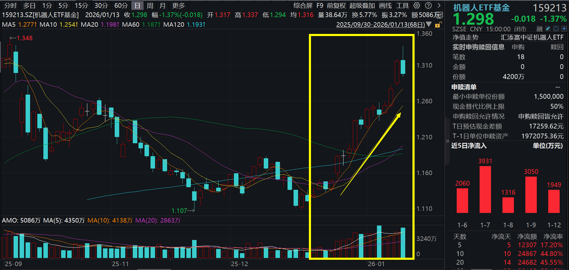 1月12日,A股市场震荡上行,沪指强劲冲高,冲击17连阳!硬科技板块接连上涨,机器人ETF基金(159213)放量上涨2.9%,冲击3连阳。盘中资金汹涌涌 入,机器人ETF基金(159213)强劲吸金超1700万元,加上今日已连续10日吸金,合计净流入超2.4亿元! 机器人ETF基金(159213)标的指数成分股多数上涨,成分股科大讯飞涨超8%,中控技术上涨6.9%,大华股份涨3.66%,机器人涨2.5%,汇川技术、绿的谐波 涨幅居前,拓普集团、大族激光等涨幅居前。 | 序号 | 代码 | 名称 | 申万一级行业 | 涨跌幅 | 估算权重 ▼ | | --- | --- | --- | --- | --- | --- | | 1 | 002230 | 科大讯飞 | 计算机 | 8.35% | 10.54% | | 2 | 300124 | 汇川技术 | 机械设备 | 1.89% | 9.89% | | 3 | 601689 | 拓普集团 | 汽车 | -2.16% | 7.54% | | 4 | 002236 | 大华股份 | 计算机 | 3.66% | 4.45% | | 5 | 002008 | 大族激光 ...