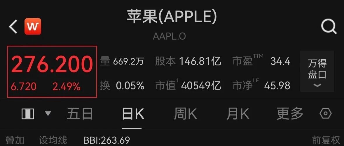 老美也涨老登 消费电子特别惨,过去三个季度 卖pc的已经不想理咱们问询了 22:42 .။ ? ( 苹果(APPLE) √ W AAPL.O 276.200 量 669.2万 股本 146.81亿 市盈™ 34.4 万得 盘口 换 0.05% 市值 40549亿 市净 45.98 6.720 2.49% ■ ▼ 五日 日K 周K 月K 电子 (0) 叠加 设均线 BBI:263.69 前复权 292.834 <- 288.620 66.020 >> 243.420 239.206 and and the best of the best of the first 1 1 1 1 2026-01-16 12-11 12-11 12-30 02-04 2025-11-21 MACD(12,26,9) DIF:0.19121 DEA:-2.72469 MACD:5.83178 " " 6.24 TRIX(12.9) -0.13 TRMA:0.00 X -0.36 卖空股数 0.00 X 0 14 49523.42 添加提醒 加自选 电子 分享 道琼斯 22:40 .II ? I 美国银行(BANK OF AMERI ...