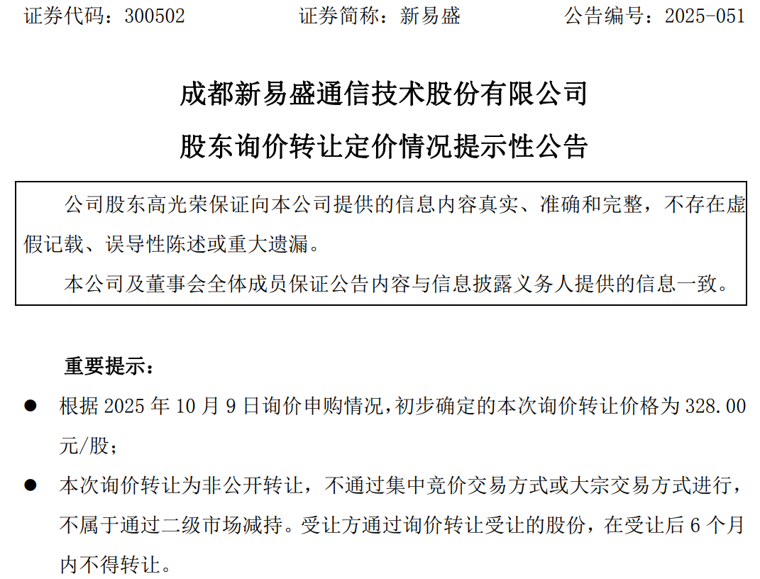 据新易盛9月30日晚间公告,公司控股股东及实际控制人之一高光荣计划通过询价转让方式转让1143.07万股,占公司总股本的1.15%,转让原因为自身资 金需求。 根据拟转让价格和转让股份计算,高光荣本次拟转让股份市值为37.49亿元。 新易盛是A股市场去年以来的大牛股,从去年4月初的46.56元一度涨至今年9月初的401.10元,并不断创新高,期间涨幅约7.61倍,目前市值为3490亿 元。截至10月9日收盘,新易盛报351.15元/股,询价转让价格较收盘价折价6.6%。 新易盛(300502)10月9日晚间公告,根据2025年10月9日询价申购情况,公司股东高光荣的询价转让初步定价为328.00元/股。参与报价及申购的机构投 资者家数为29家,有效认购股份数量为2926万股,对应的有效认购倍数为2.6倍。本次询价转让拟转让股份已获全额认购,初步确定受让方为16家机构投 资者,拟受让股份总数为1143.07万股。 2020年,高光荣以26亿元身家登上《胡润百富榜》。若以10月9日收盘价351.15元计算,高光荣身家约为258亿元。 资料显示,新易盛2016年3月登陆深交所创业板。公司专业从事光模块的研发及制造, ...