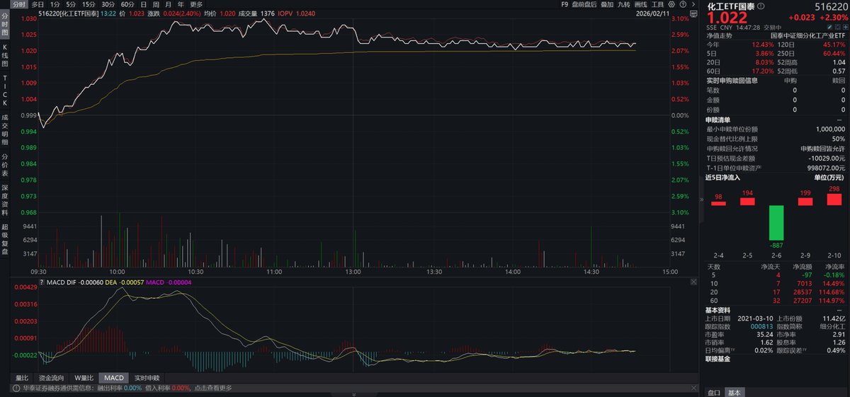 风险提示:提及个股仅用于行业事件分析,不构成任何个股推荐或投资建议。指数等短期涨跌仅供 参考,不代表其未来表现,亦不构成对基金业绩的承诺或保证。观点可能随市场环境变化而调整,不构 成投资建议或承诺。提及基金风险收益特征各不相同,敬请投资者仔细阅读基金法律文件,充分了解产 品要素、风险等级及收益分配原则,选择与自身风险承受能力匹配的产品,谨慎投资。 每日经济新闻 (责任编辑:刘畅 ) 【免责声明】本文仅代表作者本人观点,与和讯网无关。和讯网站对文中陈述、观点判断保持中立,不对所包含内容 的准确性、可靠性或完整性提供任何明示或暗示的保证。请读者仅作参考,并请自行承担全部责任。邮箱: news_center@staff.hexun.com 细分领域景气上行,化工行业景气修复可期,2月11日,化工ETF国泰(516220)收涨2.2%。 申万宏源指出,染料、PVA、维生素等细分领域景气上行。例如,染料龙头企业于节前连续上调报 价,核心中间体供应紧张;PVA因海外装置受极端天气影响,出口订单增加,价格持续攀升;维生素则 因头部厂商计划停产检修并上调报价,节后供应预期趋紧。这些品类虽属传统化工领域,但其价格联动 上涨,释 ...