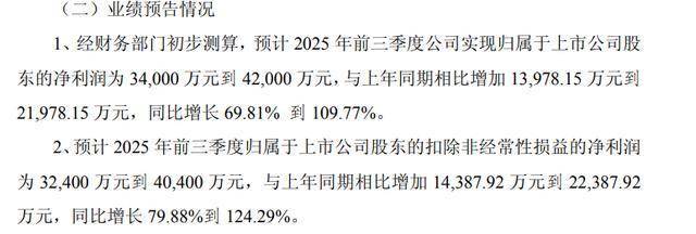 Core Viewpoint - As of September 25, 2025, 32 listed companies in the A-share market have released their performance forecasts for the third quarter, with a significant number indicating substantial profit growth, while some companies are expected to report losses [1][2]. Group 1: Performance Forecasts - 32 companies have issued performance forecasts, with 18 expecting profits, 9 anticipating losses, and 5 indicating uncertain performance [1]. - Among the companies forecasting profit growth, three are expected to see over 100% year-on-year increases: Wanhua Chemical, Changchuan Technology, and Brothers Technology [1][2]. Group 2: Specific Company Forecasts - Wanhua Chemical anticipates a net profit of 340 million to 420 million yuan, representing a year-on-year increase of 69.81% to 109.77%, driven by increased export volumes and reduced raw material prices [1]. - Changchuan Technology expects a net profit of 827 million to 877 million yuan, reflecting a year-on-year growth of 131.39% to 145.38%, attributed to strong market demand in the semiconductor industry [2]. - Brothers Technology forecasts a net profit of 100 million to 115 million yuan, with a year-on-year increase of 207.32% to 253.42%, due to rising prices of certain vitamin products and improved production efficiency [2]. Group 3: Stock Performance - The stock prices of Wanhua Chemical, Changchuan Technology, and Brothers Technology have seen significant increases in September, with respective gains of 13.2%, 58.31%, and 15.78%, outperforming the CSI 300 index [2]. Group 4: Companies with Declining Performance - Dongfang Carbon, a company listed on the Beijing Stock Exchange, expects a net loss of 58 million to 60 million yuan, marking a year-on-year decline of 62.69% to 68.3%, attributed to reduced market demand and falling sales prices [2].
