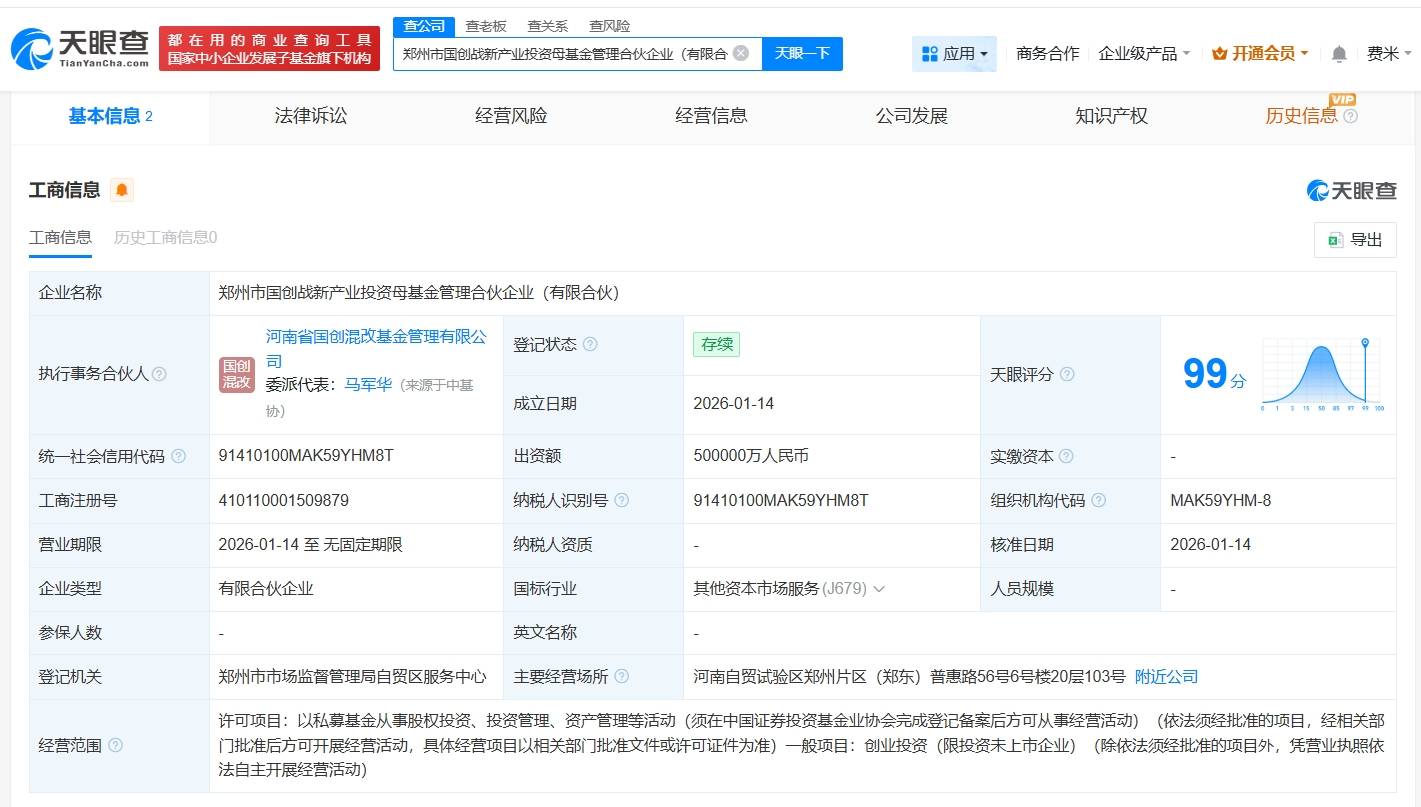 每经AI快讯,天眼查工商信息显示,近日,郑州市国创战新产业投资母基金管理合伙企业(有限合伙)成立,执行事务合伙人为河南省国创混改基金管理 有限公司,出资额50亿元人民币,经营范围为以私募基金从事股权投资、投资管理、资产管理等活动,创业投资。合伙人信息显示,该基金由河南省国创混 改基金管理有限公司、郑州产业投资集团有限公司共同出资。 | | 皇公司 都在用的商业商间丁具 | 管老板 做出版 音风险 | | | | | --- | --- | --- | --- | --- | --- | | | 中小企业发展子其全旗下机构 | 郑州市国创战新产业投资母基金管理合伙企业(有限合 8 | 大服一下 | | 商务合作 | | 基本信息 2 | 法律诉讼 | 经营风险 | 经营信息 | 公司发展 | 知 | | 工商信息 ● | | | | | | | 工商信息 历史工商信息0 | | | | | | | 企业名称 | 郑州市国创战新产业投资母基金管理合伙企业(有限合伙) | | | | | | 执行事务合伙人 2 | 河南省国创混改基金管理有限公 司 ER OIL | 登记状态 2 | 存续 | | 天眼评分 ② | ...