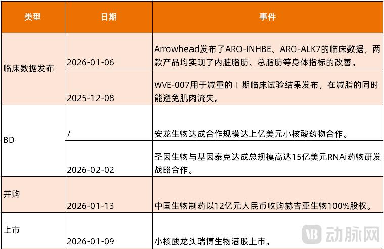 Core Insights - The small nucleic acid sector is experiencing a significant commercialization phase, driven by technological breakthroughs and successful clinical data releases in the weight loss domain [1][3][6] - Major transactions, including a billion-level acquisition by China Biologic and the Hong Kong listing of Rebio, indicate that capital exit channels are now open [1][5][6] Group 1: Clinical Data Releases - Arrowhead Pharmaceuticals announced clinical data for two siRNA obesity candidates, ARO-INHBE and ARO-ALK7, showing improvements in visceral fat and total fat in obese patients with type 2 diabetes, leading to a 10.9% stock price increase [3] - Wave Life Sciences reported that its siRNA drug WVE-007 achieved a 4.0% weight reduction and a 0.9% muscle gain in a Phase I trial, resulting in a 147.3% stock price surge [4] - The clinical data from these small nucleic acid drugs suggest potential for use either alone or in combination with GLP-1 drugs to reduce fat while preserving muscle [4][7] Group 2: Business Development Transactions - In early 2026, Anlong Bio secured an international strategic cooperation agreement in the small nucleic acid drug field worth over $100 million, marking a significant breakthrough in international business development [5] - China Biologic announced a 1.2 billion RMB acquisition of Hejiya Bio, enhancing its small nucleic acid portfolio and leveraging Hejiya's unique long-acting delivery platform [5][6] - Saintin Bio has engaged in multiple business development deals, including a strategic collaboration with Genentech worth up to $15 billion for RNAi drug development [17] Group 3: Market Trends and Future Outlook - The small nucleic acid sector is increasingly recognized as a core area for innovative drug development, with expectations for more significant events in the future [2][6] - The weight loss market is identified as a potential area for major transactions, driven by the large market size and the growing recognition of clinical efficacy for small nucleic acid drugs [7][19] - Major pharmaceutical companies are actively exploring collaborations in the small nucleic acid space, particularly in conjunction with GLP-1 drugs to enhance therapeutic outcomes [18][20]