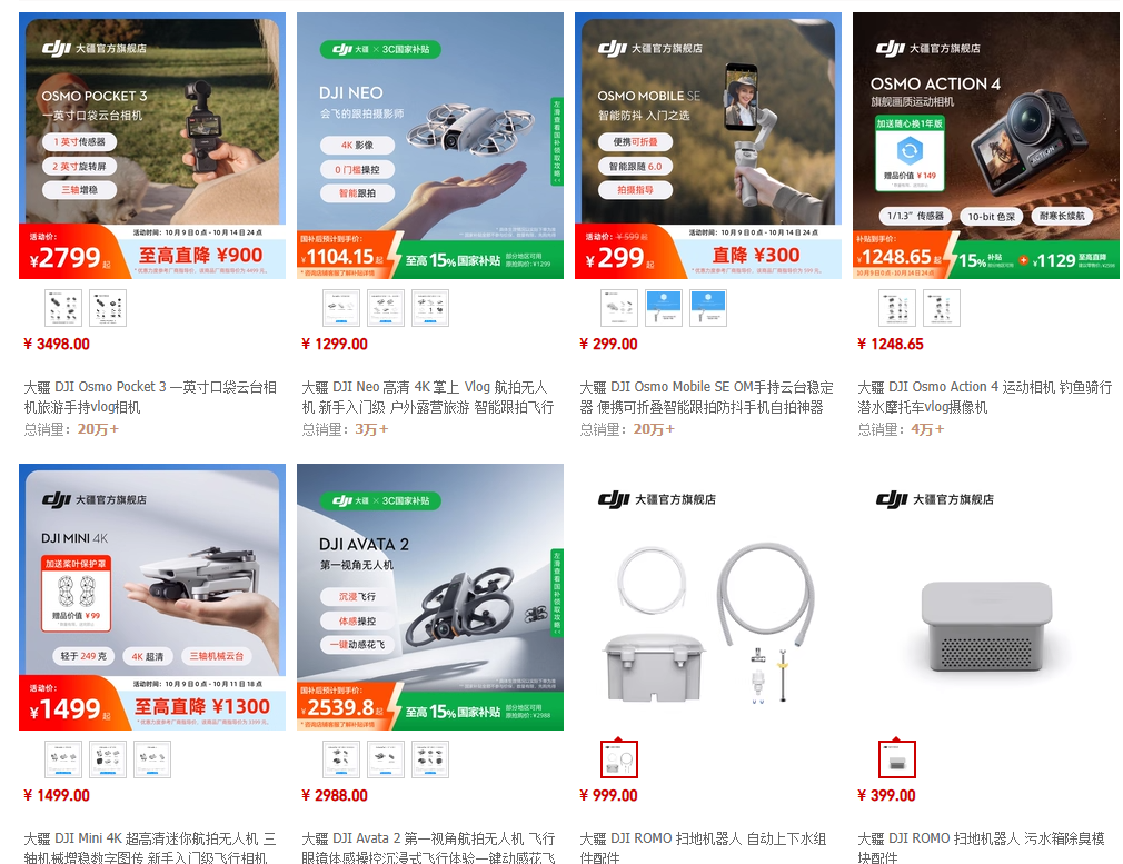 10月8日,大疆在官网提前挂出"双十一"促销信息,多款产品价格直降数百至上千元。此次降价幅度较大。从几百元到几千元不等。其中还包括今年 8月份发布的扫地机、7月份发布的全景相机等也在降价之列。此举也引发大量消费者不满,官方表示:将不断优化相关服务与沟通机制。 记者看到,此次大疆降价的幅度和范围非常广泛,以Osmo Pocket 3为例,标准版由3499元降至2799元,下调700元,全能套装版由4499元降至3599 元,下调900元;Osmo Action 4等机型同步降价数百元,最高降幅达到20%。无人机产品中,DJI Mini 4K至高直降1300元,DJI Mavic 3 Pro至高直降 3169元。对于已购买的消费者,客服表示,日常提供7天价保服务,订单支付时间后的7天内可申请价保。另外,今年8月,大疆发布了首款扫地机器 人ROMO系列;7月底,大疆发布了首款全景相机Osmo 360,这两款新品也都在降价之列。 大幅降价引发了一些已购消费者的不满。据悉,通过线上平台购买的大疆产品,由于享有"7天价保+30天无理由退货"政策,退货成功率相对较高; 而在线下门店购买的用户,如果产品已激活且无质量问题,则 ...