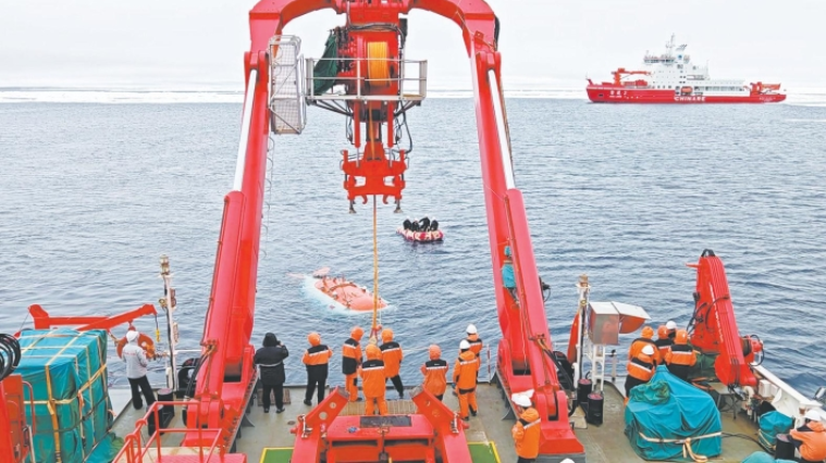 "蛟龙"号下潜作业现场。国家深海基地管理中心供图 本航次是"蛟龙"号完成国产化升级改造,继南海海试之后正式进入极区作业,成功实现了我国首次载人深潜 北极冰区下潜、首次有人/无人双潜器极区水下协同作业,深海进入和深海探测能力持续增强,充分体现我 国深海科技自立自强。在科学认知方面,一是通过对调查海域高清影像资料的 AI识别,初步研究发现,北 极部分海域底栖生物密度、生物多样性、个体体型在几十至上百公里空间范围内显著差异,可能与海底地 形地貌及水深有关,获得的数据和资料为绘制极区海域的生物多样性谱图和开展生物多样性保护提供了强 有力支撑。二是发现了疑似麻坑、溶蚀孔洞、碳酸盐岩、多个相近的大规模条带状贝类遗迹,表明调查区 可能存在历史性的冷泉喷发,为北极地区在地质历史时期的甲烷运移通道研究提供关键信息。三是通过载 人潜水器精细调查,将有效提升人类对北极深海生物多样性分布规律、生态系统适应性机制等方面的科学 认知。(部讯) 本报讯 7月15日,"深海一号"船携"蛟龙"号载人潜水器从青岛起航,执行中国大洋92航次第一航段任务,于 9月8日返回青岛。航次期间,在"雪龙2"号船破冰保障下,于北极海域完成了10余次"蛟龙"号 ...