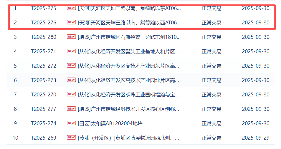 中海以92000万元总价、约3.4万元/㎡未扣除配建)可售楼面价拿下广州大道南788号二期地块。 地块位于东圃板块广棠片区内,今年三月天河自规局就宣布对棠东村、棠下村约1043亩土地征收补偿协议均已全部签订,这两宗地块就位列其中。 按照批复的《天河智谷广棠片区控制性详细规划》指出,广棠片区规划科研、商业、医疗等多元用地,并配套车陂涌湿地公园等生态设施,将着力打 造"科创研发+生态宜居"的产城融合新样板。 而在黄金周前,天河也悄悄上架了两宗宅地,起拍楼面价3万+/㎡。 | 1 | 12025-275 | LEW] [天河]天河区天坤三路以南、棠德路以东ATO6 ... | 正常交易 | 2025-09-30 | | --- | --- | --- | --- | --- | | 2 | T2025-276 | [NEW] [天河天河区天坤三路以南、崇德路以西ATO6 ... | 正常交易 | 2025-09-30 | | 3 | T2025-280 | [¤EW] [增城]广州市增城区石滩镇荔三公路东侧1810... | 正常交易 | 2025-09-30 | | ব | T2025-271 | [MEW] [ ...