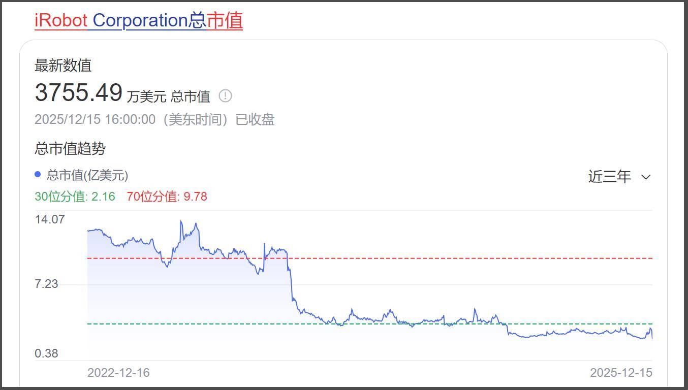 当地时间12月14日,美国扫地机器人大厂 iRobot发布公告,宣布申请破产保护,同时宣布该公司将被其产品的主要代工制造商及债权人深圳市杉川机器人 有限公司(Picea Robotics)收购并私有化。 受该消息影响,iRobot在12月15日的美股盘中交易中,股价暴跌72.69%,市值仅剩3755.49万美元。 | 最高: 1.48 | 今开: 1.20 | 成交量: 1.04亿股 | 换手: 327.57% | | --- | --- | --- | --- | | 最低: 1.07 | 昨收:4.32 | 成交额:1.25亿 | 振幅:9.49% | | 52周最高: 13.06 | 量比: 1.73 | 市盈率(TTM): 亏损 | 市净率:1.40 | | 52周景低: 1.07 | 委比: -87.50% | 市盈率(静):亏损 | 市销率:0.25 | | 每股收益:-6.56 | 股息(TTM): -- | 每手股数:1 | 总市值: 3755.49万 | | 每股净资产:-0.84 | 股息率(TTM): -- | 最小价差:0.01 | 总股本:3182.62万 | | 机构持股: -- ...