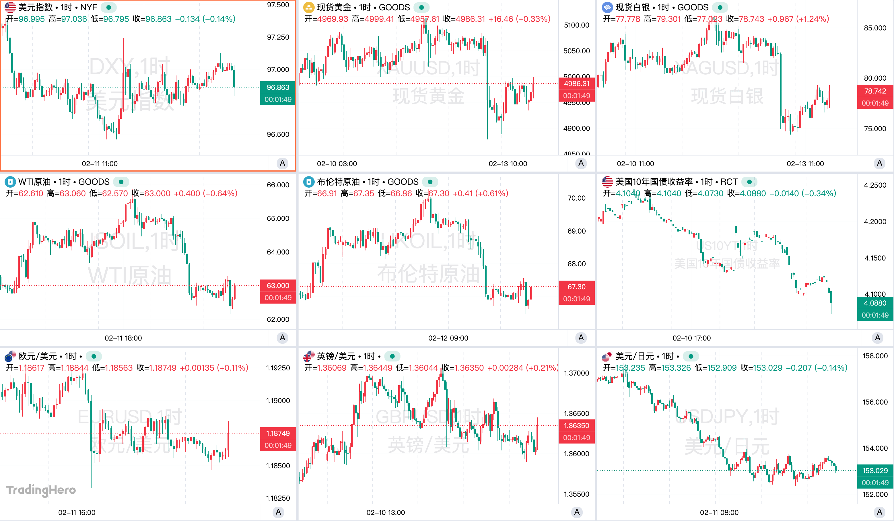 行情回顾 本周美元整体偏弱运行。周一大幅下挫至一周低点后,美指进入横盘整理,周三在强劲非农带动下短线冲高但很快回吐涨幅。周五低于预期的CPI公布后, 美指短线下挫。数据驱动特征明显,市场对美联储降息预期的反复调整成为主要影响因素。 现货黄金走势剧烈波动,整体维持高位震荡格局。周初受美元走弱提振连续上行,一度升至5100美元/盎司上方,周三非农公布后一度跳水,但在央行买盘 及地缘政治支撑下重新走强;周四因交易员抛售金属弥补美股亏损,金价盘中急挫逾200美元,最低触及4878美元。白银周内同样巨震,周四重挫近9美元, 日内跌超10%。 非美货币方面,全球资金正重新涌入日本,日元兑美元汇率有望创下一年来最大单周涨幅。高市早苗胜选后,市场对日本经济前景预期改善,外国投资者大 量买入日元资产。英国政坛动荡导致英镑走势巨震;澳元兑美元有望录得连续第六周上涨。 原油呈现冲高回落走势。周一受美国就霍尔木兹海峡航行安全发出警告影响,WTI与布伦特双双上涨;随后在周三虽有EIA库存意外大增压制,但美伊紧张 局势带来的供应担忧推动油价收涨;周四因IEA下调全球需求预期叠加风险情绪回落,油价大幅下跌。周五,据悉欧佩克+倾向于四月起恢 ...