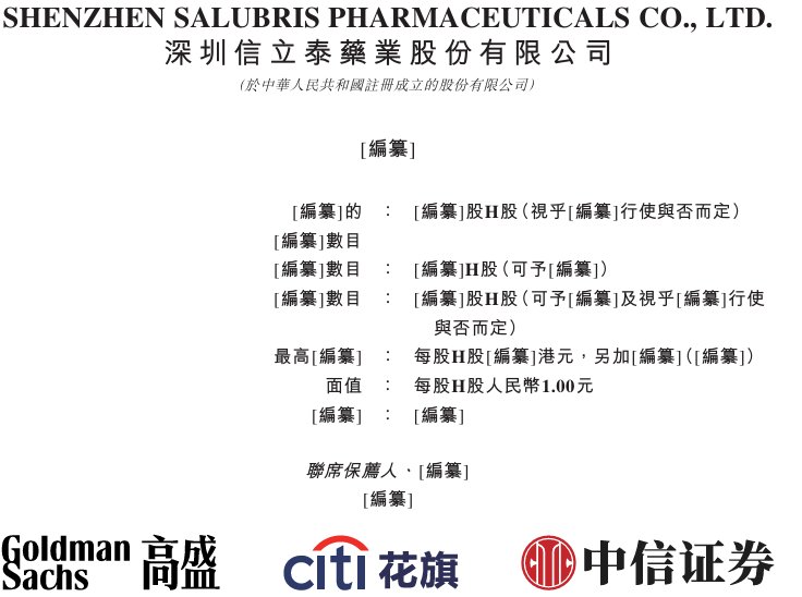 | [編纂]的 : [編纂]股H股(視乎[編纂]行使與否而定) | | --- | | [編纂]數目 | | [編纂]數目 : [编纂]H股(可予[編纂]) | | [編纂]數目 : [編纂]股H股(可予[編纂]及視乎[編纂]行使 | | 與否而定) | | 最高[編纂] 每股H股[編纂]港元,另加[編纂](「編纂]) .. | | 面值 : 每股H股人民幣1.00元 | | [編纂] : [編纂] | 据港交所2月12日披露,深圳信立泰药业股份有限公司(简称:信立泰,002294.SZ)向港交所主板递交上 市申请书,高盛、花旗、中信证券为其联席保荐人。 公司简介 据招股书,该公司是中国心血管-肾脏-代谢(心肾代谢综合征)疾病治疗领域的先行者。根据弗若斯特沙利 文的资料,2024年该公司是按收入规模计中国心血管创新药领域第二大的制药企业。截至最后实际可行 日期(2026年2月4日),根据弗若斯特沙利文的资料,该公司拥有按规模计国内企业中第二大的心肾代谢 综合征创新药管线。该公司的产品组合以创新药为战略核心,同时涵盖仿制药、生物类似药及医疗器 械,相互协同以满足心肾代谢综合征领域巨大未被满足的医疗需求。 心肾代 ...