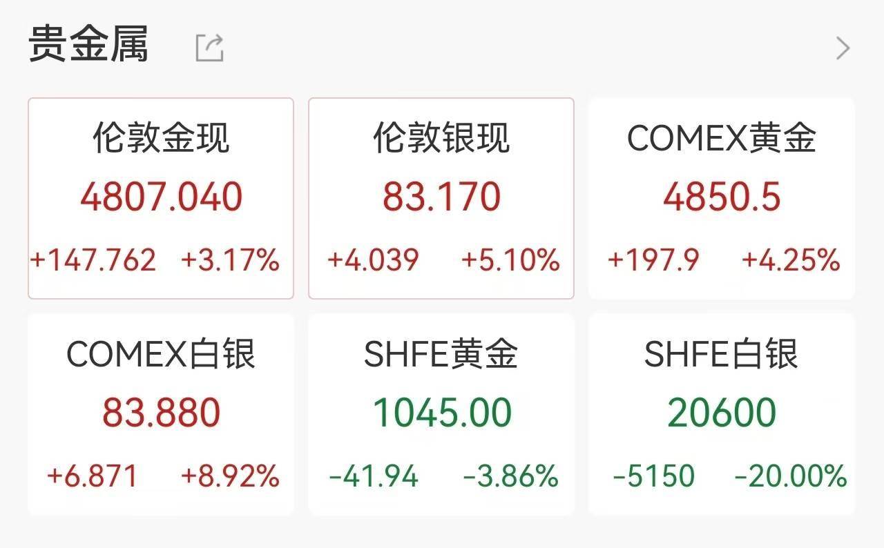Group 1 - Gold and silver prices experienced a strong rebound, with spot gold surpassing $4800 per ounce, marking a daily increase of over 3%, while spot silver broke above $83 per ounce, rising more than 5% [1] - COMEX gold futures and COMEX silver futures also saw simultaneous increases, reflecting a broader trend in precious metals [1] Group 2 - The current prices for London gold and silver are $4807.040 and $83.170 respectively, with gold up by $147.762 (3.17%) and silver up by $4.039 (5.10%) [2] - COMEX silver is priced at $83.880, showing an increase of $6.871 (8.92%), while SHFE gold is at $1045.00, down by $41.94 (3.86%) [2] - News reports indicate that Iran's president has ordered the initiation of nuclear negotiations, and high-level talks between Iran and the U.S. may occur in the coming days [2] - In the context of the Russia-Ukraine situation, negotiations regarding Ukraine are scheduled to take place in Abu Dhabi on February 4-5 [2]