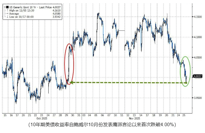 而在短短几天内,市场对美联储的利率预期发生了戏剧性逆转。 与美联储基准利率挂钩的期货合约持仓量在过去三个交易日飙升,其中1月合约上周连续两个 交易日成交量创下历史新高。 (绿线美联储12月降息概率vs蓝线明年1月降息概率) 市场定价显示,交易员们认为下个月降息25个基点的可能性已高达约80%,而就在几天前,这一概率还仅为30%。 给财经人的礼物! 金融圈"明星"日历 美联储官员"鸽声"推动市场预期逆转 投资者正大举押注美联储将在下月会议上再次降息。 周二,10年期美国国债收益率一个月来首次盘中跌破4%,摩根大通本周的客户调查显示,投资者的美债净多头头寸已升至约十五年来的最高水平。 (10年期美债收益率自鲍威尔10月份发表鹰派言论以来首次跌破4.00%) 华尔街见闻提及,美国白宫国家经济委员会主任哈塞特成为下任美联储主席热门人选的消息,提振了市场对未来一年利率走低的预期。 在过去两年多的20次美联储会议中,仅有三次交易员在如此接近政策决定时未完全消化结果。 就在几天前,市场对12月降息的押注概率仅为30%,但形势在短短几日内急剧逆转。 法国兴业银行策略师Rajappa表示, 尽管一些更担忧通胀的官员提出反对,但 ...