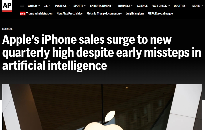 报道还提到,苹果试图通过2025年9月发布的免费软件升级,为iPhone17及更早型号引入新的"液态玻璃"设计来弥补人 工智能失误。这一策略推动iPhone销售额达到853亿美元,比上年同期增长23%,创下了自2007年iPhone首次发布以 来,苹果单季度iPhone销售额的最高纪录。 【环球网财经综合报道】北京时间1月30日凌晨,苹果公司公布了2026财年第一季度业绩,数据显示营收同比增长16% 至1437.6亿美元,其中iPhone收入852.7亿美元,稀释后每股收益为2.84美元,均创历史新高。大中华区营收255.3亿美 元,超出市场预期;美国营收585.3亿美元,略低于市场预期。 财报公布后,苹果股价在盘后交易中上涨超过1%。但今年至今,股价仍然略有下跌,与2024年底收盘价相比没有太大 变化。 美联社对此发文称,尽管苹果公司未能兑现2024年的承诺,即通过人工智能提升其Siri助手的功能,但忠实的粉丝们 仍然热切购买了最新的iPhone 17系列。 此外,尽管在人工智能方面存在缺陷,但根据市场研究公司国际数据公司(IDC)的数据,iPhone在去年末仍以近20% 的市场份额,领先于三星,位居全球销 ...