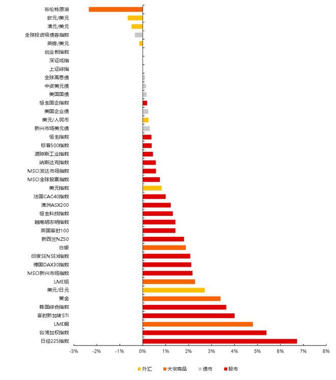 来源:市场投研资讯 大类资产近期变动(2025/10/1-2025/10/7) 美股市场全线收涨,纳斯达克指数、道琼斯工业指数与标普500指数分别录得0.57%、0.44%和0.39%的 涨幅。行业层面,Wind美国一级行业中,医疗保健(3.73%)、公用事业(2.76%)与信息技术板块 (1.48%)表现领先,二级行业中煤炭Ⅱ(5.62%)、医药生物(4.90%)及钢铁Ⅱ板块(2.83%)涨幅 居前。欧洲市场同步走强,德国DAX30、英国富时100及法国CAC40指数分别上涨2.11%、1.42%、 1.00%。大宗商品方面,LME钴(11.33%)、LME铜(4.80%)、COMEX黄金(3.39%)领涨,而受 OPEC+ 10月进一步增产预期影响,布伦特原油与纽约期油跌幅靠前。汇率方面,截至10月7日,美元指 数收报98.58,周涨0.82%;美元兑离岸人民币报7.15,周涨0.25%。 科技利好不断,美股再创新高 宏观层面来看,美国政府于当地时间10月1日零点起正式进入停摆状态,9月ADP新增就业人数意外录得 负值,市场避险情绪升温,黄金价格创下历史新高。此次停摆的直接原因是共和党与民主党未能就新财 ...