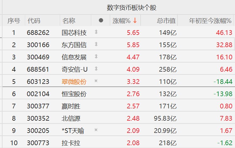 消息面上,香港特区行政长官李家超周三在Consensus香港大会开幕致辞中表示,香港作为全球Web3和加 密货币创新中心的地位日益提升。一项关键举措是去年8月实施了《稳定币条例》,这项新法为在香港发 行挂钩法币的稳定币的发行人设立了牌照制度。香港金融管理局正在积极处理牌照申请,相信首批稳定币 发行机构牌照将于下个月发放。致力于将香港打造成为数字资产全球创新中心。 格隆汇2月11日|A股市场数字货币概念股走强,其中,御银股份一度触及涨停,国芯科技涨超5%,信息 发展涨超4%,翠微股份涨超3%,恒宝股份(维权)、赢时胜涨超2%。 | | | | | 数字货币板块个股 | | | | --- | --- | --- | --- | --- | --- | --- | | 序号 代码 | | 名称 | | 涨幅%↓ | 总市值 | 年初至今涨幅% | | 1 | 688262 | 国芯科技 | 1 | 5.65 | 149亿 | 46.13 | | 2 | 300166 | 东方国信 | 1 | 5.85 | 155亿 | 32.88 | | 3 | 300469 | 信息发展 | 1 | 4.47 | 178亿 | ...