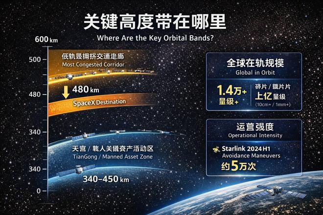 文 | 我们可能想错了 为什么星链降轨引发担忧 1月上旬,SpaceX宣布计划把约4400颗第一代Starlink卫星从550公里降到480公里轨道,理由是优化空间 安全与碎片管理。几乎同时,我国向国际电信联盟(ITU)集中申报了总数超过20万颗的低轨卫星网 络,涵盖14个星座。这两条消息一前一后,引发了中文舆论的强烈反应:从太空抢地盘到星链降轨威胁 我国空间站的解读迅速扩散。 同时需要澄清一个常见误读:Starlink不是单一高度的一层壳,它存在多壳层、多轨道面与不同任务阶 段的高度差异。舆论里常把它说成整个系统整体下移,会夸大影响范围;更准确的表达是:这次讨论的 重点是其中一批在550km附近运行的卫星向480km的迁移,以及这种迁移对低轨交通密度、衰减处置与 协同规则提出的更高要求。 降轨带来的三重影响 动机可以争论很久,但机制后果最终都会落在实际运营与管理层面。无论SpaceX的降轨是否出于善 意,它都意味着轨道环境、过程安全与资源结构的重新分布。这些后果并非假设,而是能在数据与物理 层面被验证的。 这样的情绪并不难理解。它背后不是阴谋叙事的想象力,而是两条可被验证的现实逻辑叠加出来的:轨 道资源的稀 ...
