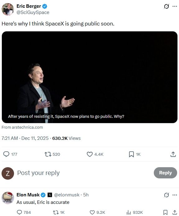 12月11日,埃隆·马斯克证实了旗下太空探索技术公司SpaceX即将上市的消息。科技媒体Ars Technica太 空行业记者埃里克·博格(Eric Berger)在社交媒体X上分享了一篇文章,其中提到Space X计划明年通过 首次公开募股筹集数百亿美元资金(IPO)。其后,马斯克在评论区回复称"和往常一样,埃里克的判 断很准确"。 据知情人士透露,SpaceX 2025年的营收预计约150亿美元,到2026年将增至220亿至240亿美元,其中大 部分销售额来自Starlink"星链"业务。12月6日,马斯克在X上发文表示:"多年来,SpaceX 一直保持着 正向现金流,并且每年两次定期回购股票,为员工和投资者提供流动性。" 稳居全球首富地位的马斯克持有特斯拉、xAI等多家知名企业的股权,目前净资产超过4600亿美元。据 彭博亿万富豪指数推测,2023年3月时马斯克持有SpaceX约42%股权,如果该公司能在明年以1.5万亿美 元的估值成功上市,马斯克的身家有望在当前基础上再翻一倍有余,或进一步拉开与其他顶级富豪的差 距。 采写/综合:南都N视频记者 樊文扬 马斯克在X平台上回复博格。 据路透社11日报道, ...