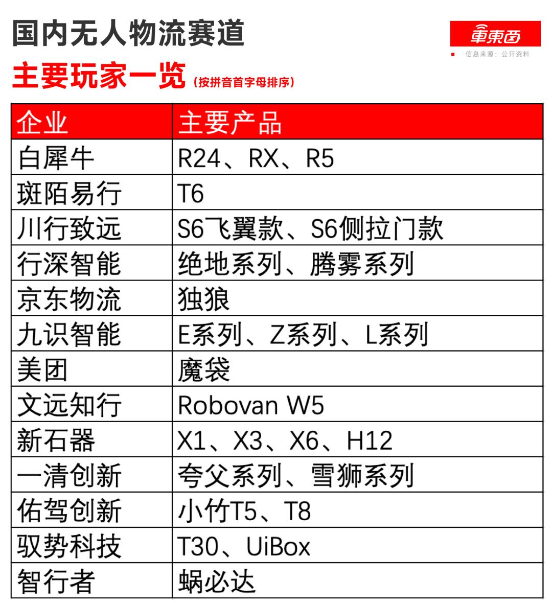 更具商业化前景的无人配送,成为自动驾驶玩家的新选择。 2025年爆火的L4无人物流,2026年更火爆了。 如果说2025年是L4级无人物流的"点燃之年",那么步入2026年,这股火焰已经烧成了燎原之势。 | 川に | | | --- | --- | | 主要玩家- | 一八(按拼音首字母排序) | | रू गा | 主要产品 | | --- | --- | | 白犀牛 | R24、RX、R5 | | 斑陌易行 | T6 | | 川行致远 | S6飞翼款、S6侧拉门款 | | 行深智能 | 绝地系列、腾雾系列 | | 京东物流 | 独狼 | | 九识智能 | E系列、Z系列、L系列 | | 美团 | 魔装 | | 文远知行 | Robovan W5 | | 新石器 | X1、X3、X6、H12 | | -清创新 | 夸父系列、雪狮系列 | | 佑驾创新 | 小竹T5、T8 | | 驭势科技 | T30、UiBox | | 智行者 | 蜗必达 | 国内无人物流赛道主要玩家一览(按拼音首字母排序) 从车队数量上看,新石器突破1.5万台交付量级,进一步跑通商业闭环,九识智能与菜鸟集团的无人车业务正式达成深度整合,形 ...