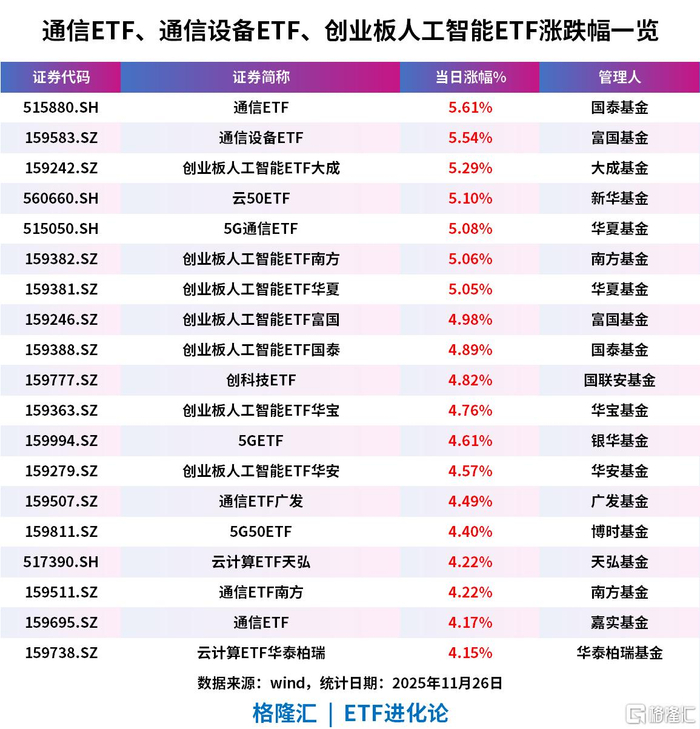 “易中天”同日大涨,通信ETF、通信设备ETF、创业板人工智能ETF涨超5%