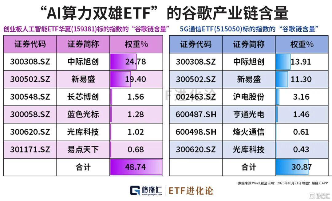 谷歌TPU引爆的新"AI算力链"行情,仍在进行中。 其中,CPO板块表现亮眼,已连续两日大爆发。"AI算力双雄"5G通信ETF(515050)今日狂飙5.08%,年内涨77.65%;创业板人工智能ETF华夏(159381)今日 涨5.05%,自今年3月24日上市以来涨71.09%。 在谷歌TPU产业链的突袭下,AI硬件叙事迎来重大转折,资本市场对于AI的投资逻辑,也在发生深刻变化。 在这场转折中,到底孕育着哪些确定性机会呢? AI算力剧变 谷歌对于AI叙事的冲击,源于两个: Gemini 3"赶超"ChatGPT,大获市场赞誉; TPU芯片发布,风头一时无两,据报meta已经有意使用TPU。 野村证券分析师认为,谷歌的最新模型已经"重置"了"AI层级棋盘",将市场拉入"新的DeepSeek时刻"。 可以说,谷歌重新激活了AI算力市场,谷歌TPU产业链迅速升温,特别是"TPU+OCS(光交换)+CPO"的高效能架构。 这或许正是创业板人工智能ETF华夏(159381)、5G通信ETF(515050)爆发的原因,两者的"谷歌链含量"分别达到48%、30.87%。 | 证券代码 | 证券简称 | 权重% | 证券代 ...