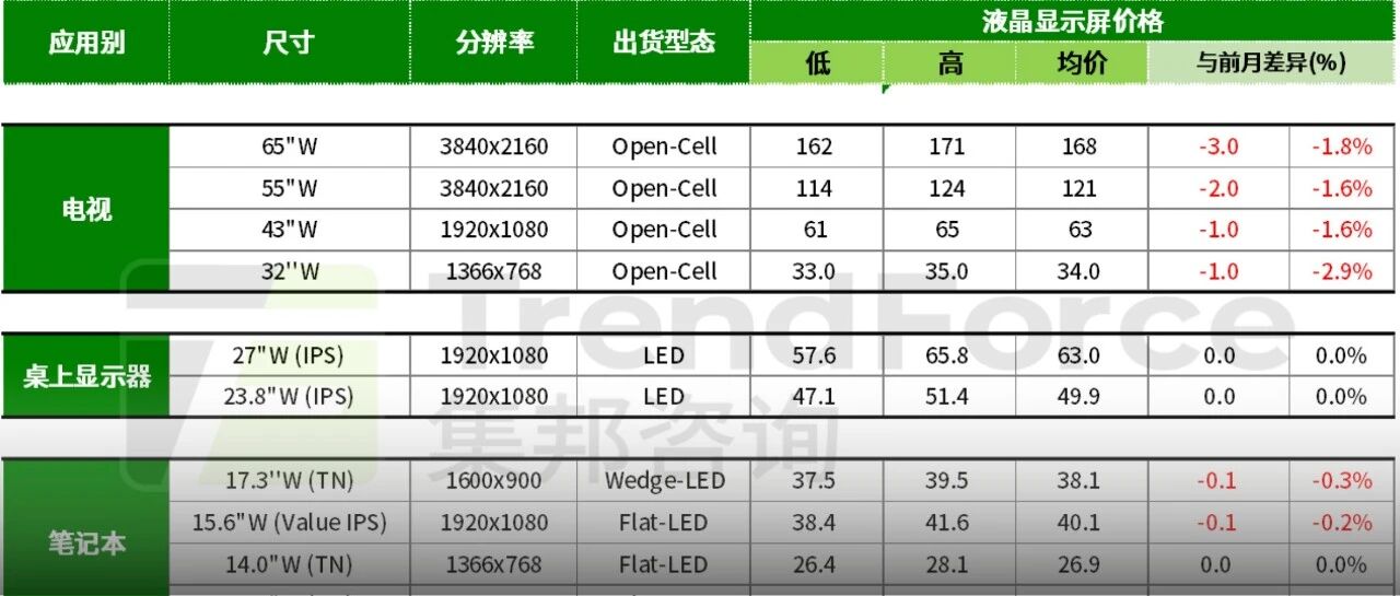 Core Viewpoint - TrendForce's latest report indicates a comprehensive decline in television panel prices, while monitor panel prices remain stable, and slight decreases are observed in certain laptop panel prices [2][5][6]. Television Panels - The average price of 65-inch television panels is $168, down $3 from the previous month, a decrease of 1.8% [5]. - The average price of 55-inch television panels is $121, down $2 from the previous month, a decrease of 1.6% [5]. - The average price of 43-inch television panels is $63, down $1 from the previous month, a decrease of 1.6% [5]. - The average price of 32-inch television panels is $34, down $1 from the previous month, a decrease of 2.9% [5]. Monitor Panels - In November, monitor panel prices remained stable, with the average price of 27-inch IPS panels at $63 [6]. - The average price of 23.8-inch IPS panels is $49.9, with no change from the previous month [6]. Laptop Panels - The average price of 17.3-inch TN panels is $38.1, down $0.1 from the previous month, a decrease of 0.3% [8]. - The average price of 15.6-inch Value IPS panels is $40.1, down $0.1 from the previous month, a decrease of 0.2% [8]. - The average price of 14.0-inch TN panels has stabilized at $26.9 since July 2024 [8]. - The average price of 11.6-inch TN panels has also stabilized at $25.1 since July 2024 [8].