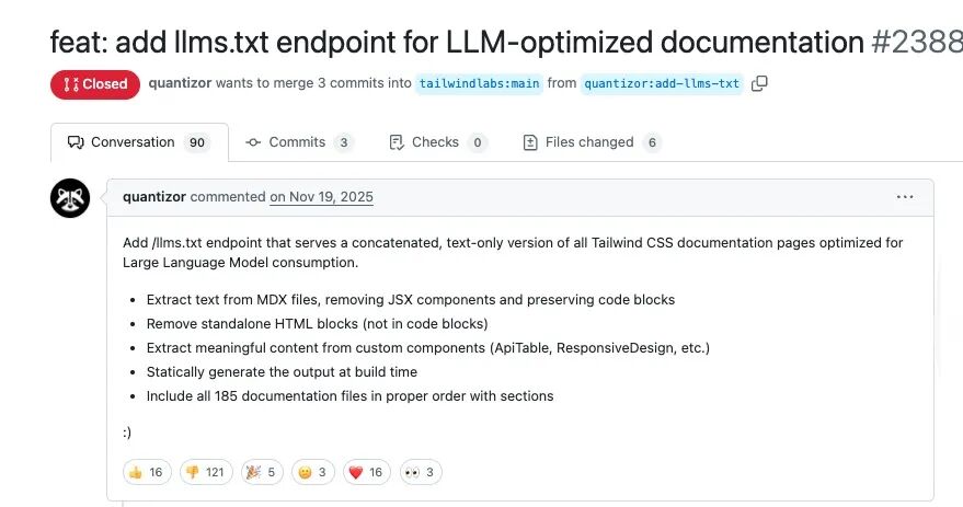 【导读】:一个为 AI 优化文档的 PR 被知名开源框架 Tailwind 创始人 Adam 紧急叫停,理由是团队日子不好过,AI 冲击下裁了 75% 工程师,要优先 把精力放到能活下去的地方。这引发了社区激烈讨论。 一、导火索:一个 AI 友好的 PR,为何引爆社区论战? 2025 年 11 月,有个开发者 quantizor 在 Tailwind CSS 的 GitHub 仓库发起了一个特殊的 Pull Request( #2388 )。 这个 PR 的核心诉求很简单:为 Tailwind 官网文档新增一个 /llms.txt 端点,把文档转换成纯文本格式,专门适配大型语言模型(LLM)读取。 为了做好这个功能, quantizor 花了不少心思:不仅剔除了文档里没用的 JSX 组件和 HTML 代码,还保留了核心的代码块;通过 markdown 语法树 解析器简化输出,前后写了 1535 行代码,反复优化了三个版本。 三周前,他还特意告知团队成员 @reinink ,可以开始审核这个 PR 了。 谁也没想到,2026 年 1 月 6 日,Tailwind 创始人 Adam 直接关闭了这个 PR。他给出的 ...