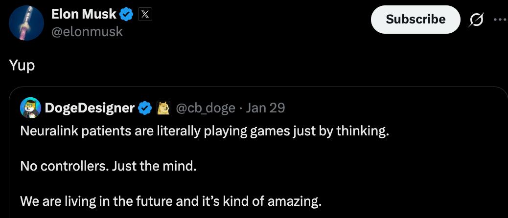 近日,「发推狂魔」马斯克转发了一个帖子,Neuralink 植入脑芯片的患者,现在已经能靠脑子里的意念直接玩游戏了,完全不需要手柄、鼠标、键盘啥 的控制器。 对于网友「我们正生活在未来,这太神奇了」的感叹,马斯克只简单地回复了一个「Yup」。 截至目前,Neuralink 在全球范围内已有 21 人参与其 Telepathy(心灵感应)植入设备的临床试验,这一数字相比去年 9 月的 12 人有了显著增长。 这些植入设备专门为瘫痪患者设计,帮助他们仅通过思维就能控制电脑、游戏和各类数字工具。 他们可以浏览互联网、流畅地移动屏幕光标,甚至玩电子游戏,所有这些都不需要动一根手指。 马斯克的 Neuralink 做的事,即使放到现在,也感觉像是科幻电影里的情节。 有网友评论称,大约十五年前,他还是本科生时,第一次对脑机接口(BCI)产生兴趣并参与相关研究,当时他觉得这就像一种梦幻般的科技,实际落地 似乎遥遥无期,进展也非常缓慢,因为当时的公司并不认为它具有商业可行性。如今看到这个梦想一点点变成现实,真是令人振奋。 脑机接口:瘫痪患者用「意念」玩游戏、打字 早期试验参与者的日常生活已经因这项技术发生了实质性改变。 一开 ...