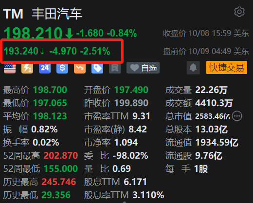 美股异动|丰田汽车盘前跌2.5% 由于软件错误在美国召回超39万辆汽车