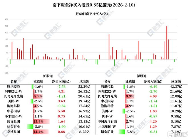 据统计,南下资金已连续9日净买入小米,共计40.236亿港元;连续5日净买入阿里,共计45.9095亿港 元;连续3日净买入中芯国际,共计9.7441亿港元。 北水动向 长飞光纤光缆:根据华源证券,光纤价格已经温和上涨了约半年时间,其中G.652.D裸光纤价格从不到 20元/芯公里一路上涨,进入2026年后开始加速上涨。核心原因在于光纤供需的反转:供应端产能在不 断出清,而需求端AI数据中心建设加速驱动,导致各类光纤出现供不应求的情况。该行指出,光纤市 场的集中度较高,收入及盈利能力受需求影响显著。 阅文集团:中银国际指出,根据新华网2026年1月数据,阅文集团已有十多部作品播放量破亿,80多部 漫剧作品播放量破千万。随着Seedance2.0发布,漫剧制作成本进一步降低,制作效果进一步提高,行 业有望迎来加速发展。 泡泡玛特:消息面上,汇丰环球研究分析师Lina Yan在报告中判断,"Labubu带来的超高速增长会褪 去,但平台能力会延续",并将2026年定义为"再定基"的一年。瑞银认为,数据有助于缓解市场对单一 爆款依赖的担忧,同时新IP Twinkle在2026年初开局强劲,为增长接力提供观察窗口。 2 ...