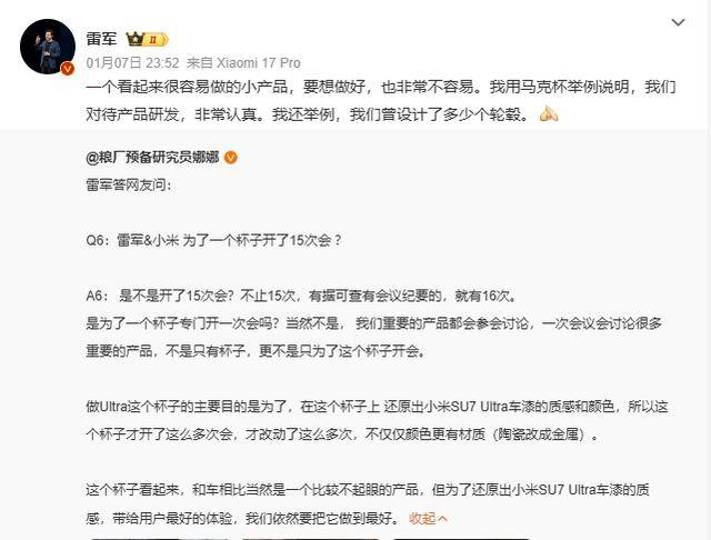 站长之家(ChinaZ.com)1月8日 消息:昨晚,小米创始人雷军在直播过程中,针对近期网络上流传的一 些谣言进行了回应,其中关于"为了一个杯子开15次会"的话题引发了广泛关注。雷军直言,实际开会次 数不止15次,有据可查且有会议纪要的就有16次。 他特别强调,并非只围绕这一个杯子开会,"我们重要的产品都会参会讨论,一次会议往往会涉及多个 重要产品,绝非只聚焦于杯子,更不是单纯为了这个杯子而开会。"雷军解释道,研发Ultra这款杯子的 主要目的,是在杯子上精准还原出小米SU7Ultra车漆的质感与颜色。 直播结束后,雷军还专门发布微博再次强调,一个看似容易制作的小产品,要想真正做好其实非常不容 易。他以马克杯为例,表明小米对待产品研发始终秉持认真的态度,还举例提到团队曾设计过多个轮 毂。 为了实现这一目标,团队不仅在颜色上反复调试,还在材质上进行了重大改动,将原本的陶瓷材质更换 为金属材质,因此才开了这么多次会,进行了多次改动。他表示,尽管这个杯子与汽车相比,看起来是 一个相对不起眼的产品,但为了给用户带来最好的体验,还原出小米SU7Ultra车漆的质感,团队依然全 力以赴,力求做到尽善尽美。 ...