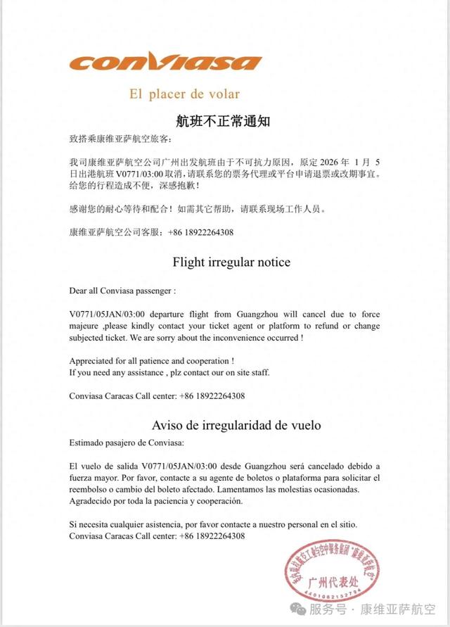 1月3日下午,委内瑞拉康维亚萨航空通过微信公号发布航班取消通知:由于不可抗力因素,原计划于 2026年1月5日3点起飞的V0771航班由广州飞往加拉加斯已被取消。据公开信息,该航线系中国唯一直 飞委内瑞拉的航线。 尽快回国,近日可以先搭乘飞机前往委内瑞拉周边国家,再想办法转机回国。目前从委内瑞拉返回中国 的航班显示正常,如果要搭乘直飞航班,需等到1月16日。 外交部领事司也于1月3日晚发布提醒。领事司表示,1月3日,美国对委内瑞拉实施军事打击,委安全风 险显著上升。外交部和中国驻委内瑞拉使馆提醒中国公民近期暂勿前往委内瑞拉,已在当地人员和机构 密切关注当地安全形势,切实加强防范措施和应急准备,非必要,不外出,务必远离冲突或敏感地区。 如遇紧急情况,请及时报警并联系中国驻委内瑞拉使馆寻求协助。 航班管家APP显示,这趟广州往返加拉加斯的航班需经停莫斯科,全程约30个小时。1月5日起飞的 V0771次航班为最新的一班,下次起飞将是1月19日。 极目新闻报道称,康维亚萨航空公司中国区客服表示由于国际形势不稳定,出于安全考虑,1月5日的航 班已经取消,将为乘客办理全额退票或改签手续,执飞的客机将空机返回委内瑞拉。在委 ...