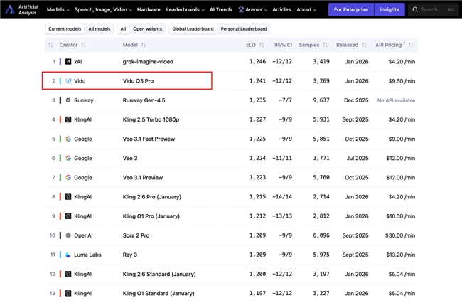 刚刚过去的2025年,AI 视频行业正在经历一场深刻变革——从"生成玩具",演进为真正的"内容生产力 工具"。在这一过程中,生数科技的 Vidu 系列模型持续推动行业能力边界的前移。 从早期的视频生成,到 Vidu Q2 实现"演技生成" 的关键跃迁,再到 Vidu Agent"一键成片",打通完整工 作流,AI 视频的创作门槛持续降低。 今天,这场演进迎来新的里程碑:Vidu Q3正式发布。这是一款以「为剧而生」为核心理念打造的新一 代模型,也是全球首个支持 16 秒音视频直出的 AI 视频模型。 在国际权威AI基准测试机构Artificial Analysis 最新公布的榜单中,Vidu Q3 排名中国第一,全球第二, 超越 Runway Gen-4.5 ,Google Veo3.1和 OpenAI Sora 2。Vidu 正用实力让世界看清"中国速度",领跑视 频生成的下半场。 | Artificial A Analysis | Models v | Speech, Image, Video - Hardware Leaderboards - Al Trends | | Arenas v Article ...