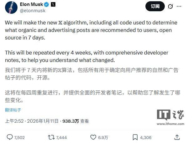 IT之家 1 月 11 日消息,马斯克今日宣布,将在一周内正式开源 平台最新的内容推荐算法。 马斯克称,本次开源将覆盖"所有用于决定向用户推荐自然内容和广告内容的代码",并强调这只是第一 步。后续将每四周更新一次代码,同时附带开发者说明,标注算法和逻辑上的改动内容。 此外,马斯克此次宣布开源 算法的时间点也引发了一定争议。近期,马斯克及其 AI 初创公司 xAI 正面 临来自不同国家和政治立场的批评,焦点集中在 Grok 对深度伪造图片等敏感内容的处理尺度上。在这 样的背景下,算法开源是否能够真正提升平台透明度,仍有待观察。 这意味着,外界或将首次系统性地看到 如何决定向用户推荐自然内容与广告内容,并进一步理解信息 流中争议性内容频繁出现的技术原因。 IT之家查询获悉, 的前身 Twitter 曾在 2023 年开源过部分推荐算法代码,但相关 GitHub 仓库长期未更 新,绝大多数文件仍停留在最初发布阶段。此次马斯克的表态,被视为对"透明化算法"承诺的一次重 启。 不过,外界对这一承诺仍持谨慎态度。马斯克过去曾多次表示将开源 及相关技术,部分承诺确实落 地,例如 2024 年开源的 Grok-1 模型;但目 ...