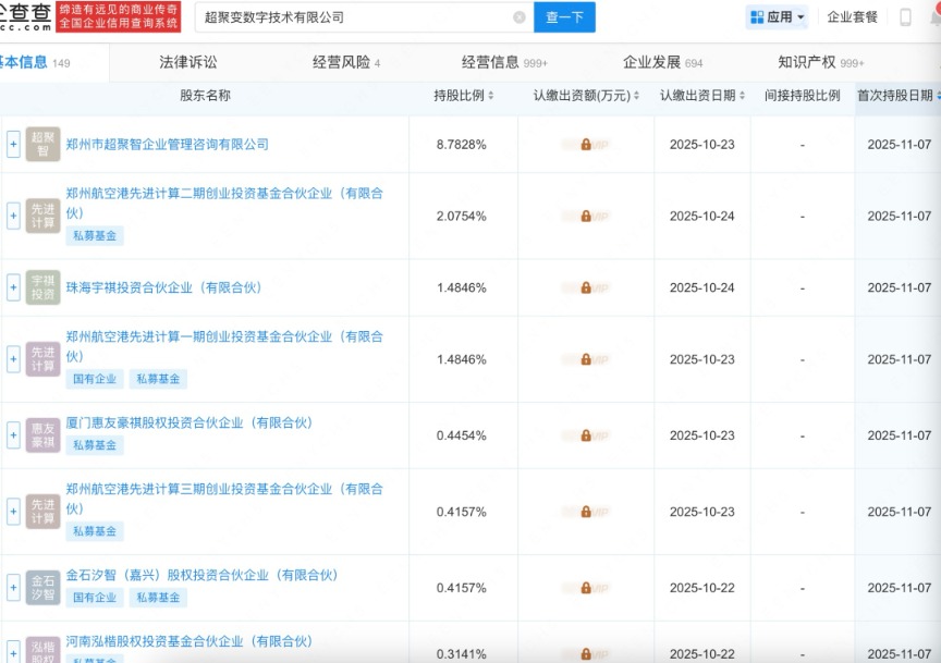 | | 细遣有远见的商业传奇 超聚变数字技术有限公司 全国企业信用查询系统 | | ® | 查一下 | | 品应用 · 企业套餐 | ਸੀ। ਉਸ | | --- | --- | --- | --- | --- | --- | --- | --- | | 本信息 149 | 经营风险 4 | 法律诉讼 | 经营信息 999+ | | 企业发展 694 | 知识产权 999+ | | | | 股东名称 | | 持股比例 = | 认缴出资额(万元) = | 认缴出资日期 ÷ | 间接持股比例 | 首次持股日期 # | | | 郑州市超聚智企业管理咨询有限公司 | | 8.7828% | BUIP | 2025-10-23 | . | 2025-11-07 | | 1 | 郑州航空港先进计算二期创业投资基金合伙企业(有限合 伙) | | 2.0754% | AVIP | 2025-10-24 | | 2025-11-07 | | | 私募基金 | | | | | | | | | 珠海宇祺投资合伙企业(有限合伙) | | 1.4846% | BVIP | 2025-10-24 | - | 2025-11-07 | | ...